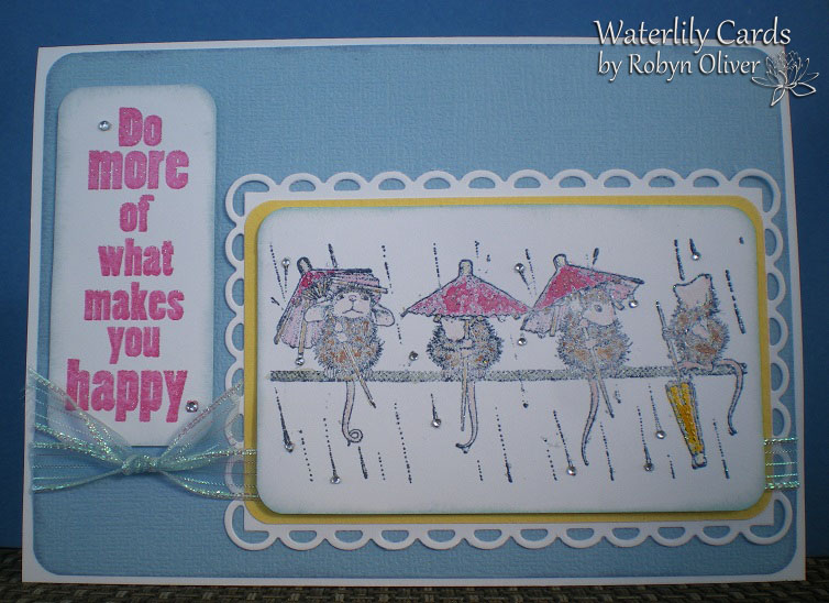 Been a busy week unpacking and setting up here at our place....lucky I'm not working as yet so I found time to make a card ...This is my card for the Society of Stampaholics Card Chain challenge - I've used the colours and both the theme "Umbrellas" and "Water" as the product ... mixing up my twinkling H2Os that I used to paint the stamped image. If you'd like to play along and share your stash of cards click the link and visit their blog. Thanks for taking a peek