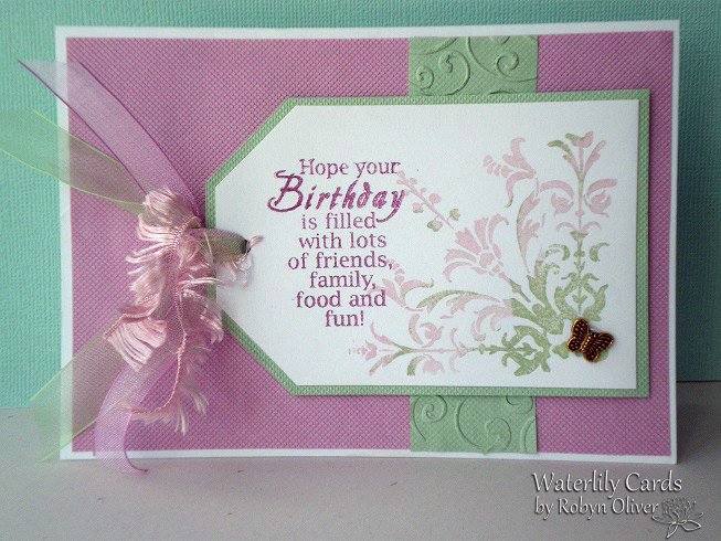With some quiet time this afternoon I'm posting a 'pretty' birthday card I've made using the layout at Freshly Made Sketches #96. It was nice to work with some feminine colours and I like using pink and green together. Thanks for taking a peek