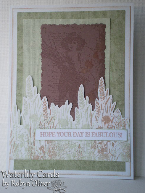 Here's the second card I've been working on for the Inspired by Stamping Inspiration Challenge this one for the #62 challenge. The little farm boy is stamped in Versamark and I used various different foliage stamps to create the screen at the front and around the edge of the background card. Thanks for taking a peek....Cheers and have a wonderful weekend