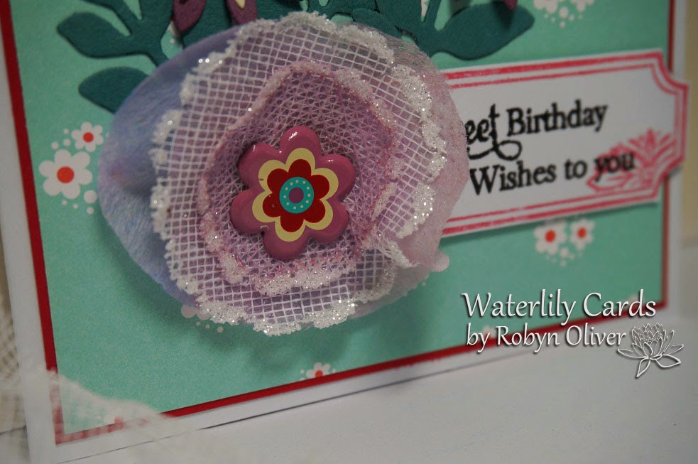 This afternoon I've put together this card for the Inspired by Stamping Whoo Hoo Wednesday technique challenge. The DT girls go to a lot of trouble to try out new techniques and present them for us to try....this weeks technique is using dryer sheets to make flowers...well I don't have a dryer so I used some woven stiffening and and layered with some very fine lining fabric. I used a flower brad to hold the layers together and then repeated the brad with die cut flowers and some die cut leaves. Finished off with a label and sentiment from Inspired by Stamping - Lovely Birthday set.Thanks for taking a peek Robyn