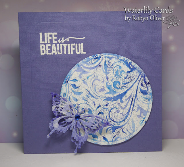 Good gracious Robyn! what a lot of water surrounding you - so glad to hear you are safe (although probably quite soggy!) I hope your vehicles survive!? and glad to hear you are ok! Love the blues you used on your lovely scroll stencil and the pretty circle framing with the added die cut scroll - a beautiful card for the challenge! xx