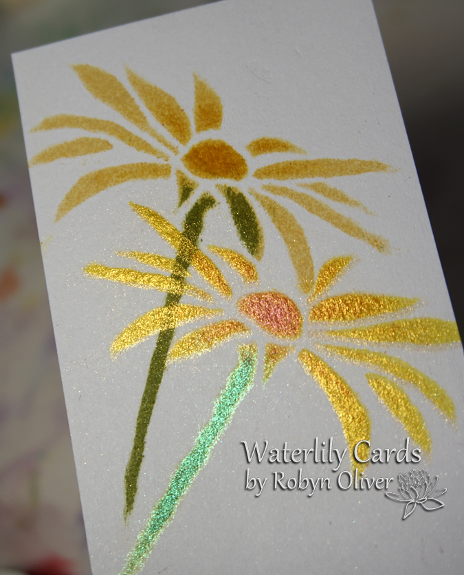 Well I've had some fun this month using shiny pigment powders with stencils (I have just a few Lindy's Magical Micas and Pearl Ex) .... with some not so creative efforts but I did figure out that the powders I have didn't really make an impact for me so I decided to sponge on some ink, then Versamark and finally dusting with the powders...see below - first pic -- top flower inked with DI and bottom one with the addition on Versamark and a yellow shade mica for the petals, pink for the center and green on the stem. In the bottom pic I added a gold Pearl Ex to the petals so the two flowers are slightly different. To finish my card I stamped and die cut my sentiment and a section of foam sheet to lift the sentiment and used a stitched die cut panel larger than my image piece to give it a frame and used a burnt orange card.