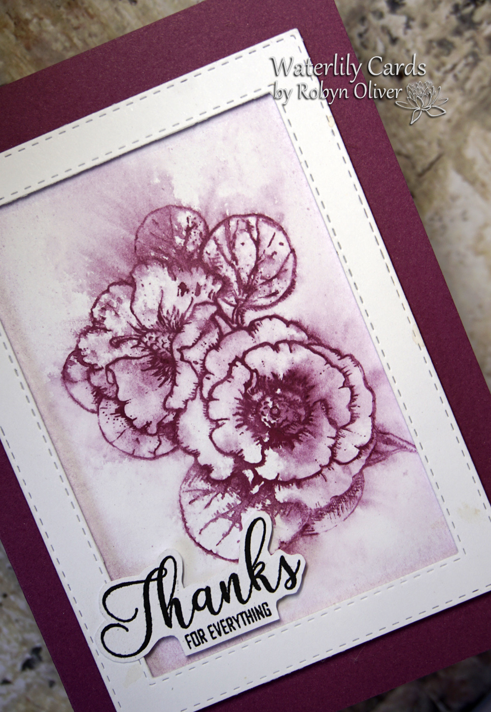 I tried something different with this Thank You card.... using watercolour pencils. I first stamped my floral stamp onto a damp baby wipe so the surface was just damp and would pick up the colour from the pencil... it worked really well, scribbling over the surface. I sprayed a very very light mist of water and stamped the image onto white card, then I gave liberal spray to the stamped image and it moved the watercolour pencil line around, and I blotted it carefully with paper towel. I die cut a stitched frame in white card and mounted this with foam sheet over the stamped panel and attached to a matching maroon card. To finish I stamped the sentiment, and fussy cut it and attached with foam tape too.