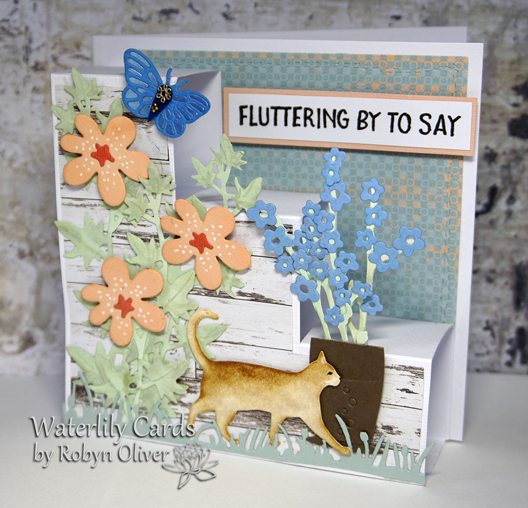 ReplyDeleteWOW! Gorgeous step card Robyn! Love all the elements to lovely garden card. Especially love that you included the cat!! Speaking of which, your cat is beautiful. xx