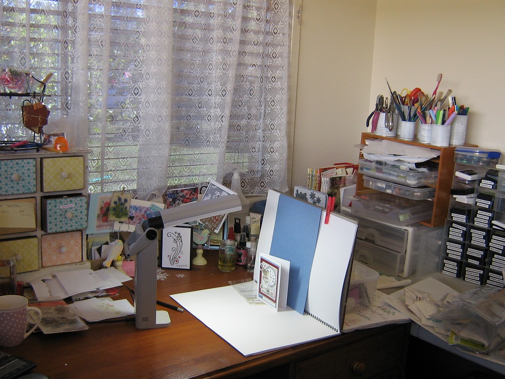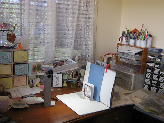 Hi and welcome to my desk this morning whre I am sharing it in all it's creative activity for Week 318 at What's On Your Workdesk Wednesday... an initiative started by our lovely hostess Julia, 6 years ago....want to find out more about this phenomena pop over to her blog, and maybe you'll find out you'd like to join in, it's fun, inspiring and addictive.This is how I photograph my cards... nothing flash, just get my Ott-Lite positioned and a coordinating background colour sheet and I'm in business. My white work pad comes in handy for this job, held up with a box of bits and pieces. My mid morning coffee mug there on the left next to a Christmas stamp waiting to be used. Behind that my ever growing stash of things I try out, cut out and don't use or embellishments - that all need to be put away. Far right my gems/pearls folder (see below) I store them in ATC pockets, easy to see and find quickly. That's it for today, off to make an afternoon cuppa and do some desk peeping...thanks to those who visited last week and hope you all enjoy some crafting time this week