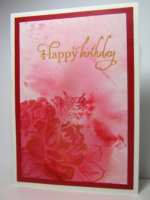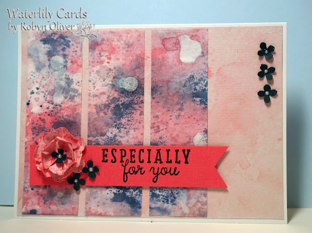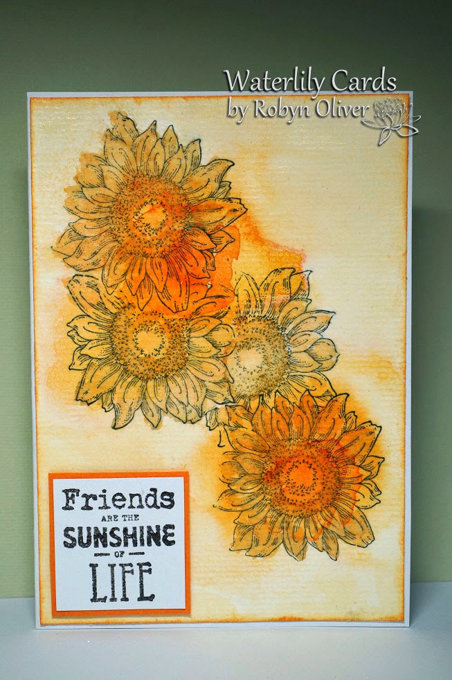 Yesterday afternoon I was playing around some old drawing ink I have to see how they worked compared with distress inks -and they're not too ; this is a bright orange one dripped onto wet watercolour paper and then I diluted it heaps and painted in the white space, and masked and stamped my sunflower Finished off by inking the edge and adding a sentiment. So the bright orange fitted just nicely with the monochromatic theme at