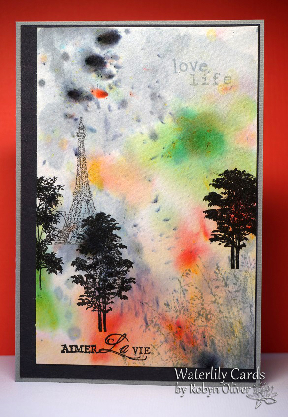 mmmmm not much mojo happening for me today seeing as I have a birthday card to make for our daughter next week.... so I decided to have a play with my Brushos and was inspired by the elements of the Fusion challenge - Paris Rain. The striking colours of orange, yellow and green against the greys and black had me stepping out of my comfort zone but I'm quite happy with end result. I stamped on the Eiffel Tower and some grasses in greys and then added some black with silhouette trees. To finish I stamped the sentiment (that came with the Eiffel tower stamp) and then checked the interpretation and added an English version. I used the sketch also. Thanks for taking a peek