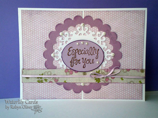 A little mauve card for a birthday or friend from my desk this afternoon. I've used the layout from the Inspired by Stamping July Blog Hop and incorporated some background paper with small polka dots to run with the theme at Annabelle stamps ac167. At Papertake Weekly the challenge is to use a diecut or punch on you card - I cut a double scallop circle to create a frame and a white frilly one to mount the sentiment.Thanks for taking a peek