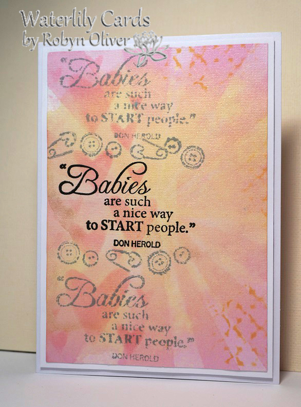 Today I was so itching to make a card and all August there were thoughts to again join in with the CASEplorations over at Stamplorations and now I've not much time to enter my post. I have also chosen to make a BABY card for Shery who has recently had a little girl - Congratulations to the Russ family. I created the background with mists and stencils and then stamped the sentiment three times (CASEing Karens card below). Thanks for taking a peek
