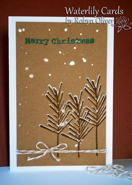 YYYAAAHOOOO, my first Christmas card for this year (last year I had half of my 70 odd made - so you can see why I'm happy). This card is a CASE of Kims card over at Stamplorations - May CASEplorations...I love her card; white on the kraft. And over at Merry Monday #159 - a request for a card with Non-Evergreen trees. Now I am not at home and didn't bring my collection of Christmas stamps so I had to be creative...found 'twig' stamp and thought it could pass for a tree, stamped in dark brown and added some snow with a white gel pen. Finished off with a sentiment, a flick of pearl mist and a wrap of twine and bow. Thanks for taking a peek