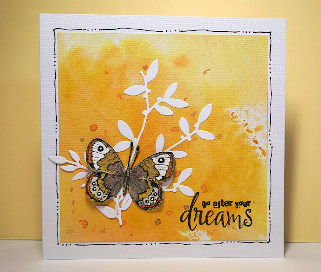 My card today is for the CASEplorations July challenge at Stamplorations... and I decided to CASE Monika's card below on the Inspiration Project Post #26...loved the colour (in a yellow mood this week), loved the white die cut leaves and loved the hand drawn border - don't do this very often so it was my set out of your comfort zone thing. I've been using up this yellow masterboard I made a few weeks back and added a few extra 'blops' in Twinkling H2Os so they are shiny. I also coloured my stamped butterfly with H2Os and gave him new feelers..black inked flower stamen. Finished my card with a Stamplorations sentiment and my border. Thanks for taking a peek