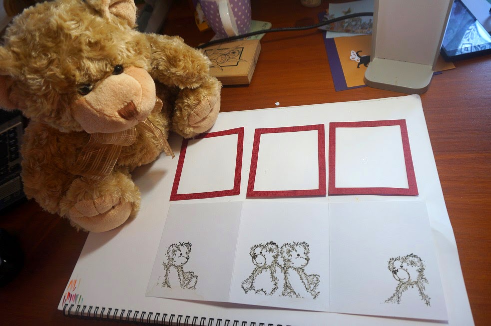 My tri-fold card features bears because my new birthday bear Louie from my dear family, is sitting here on my desk guarding my eraser that always seems to get lost. I partially stamped my bears on the three pages, coloured them with watercolour pencils and then framed them with deep red textured cardstock. A couple of simple sentiments and a bow finished my card. Thanks for taking a peek Robyn