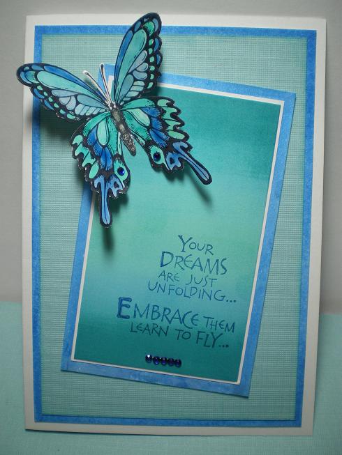 I'm spending my Saturday skyping with my friend Vikki as usual....and have attemped the monochromatic challenge set by the crazy 4 challenges ladies. I had this stamped on gloss card butterfly just waiting to be used so I painted it up with my twinkling H2Os and here it is...... thanks for having a peek!!!