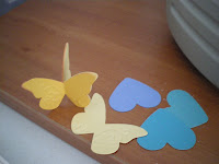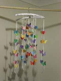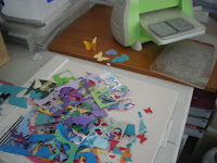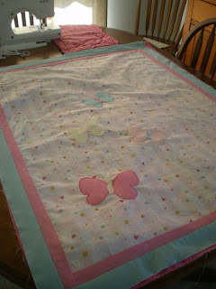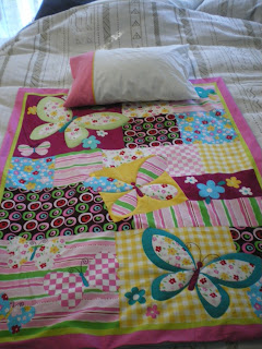 Following I have some pics of the activity over the weekend when our kids were visiting. Jacalyn and I made a butterfly/heart mobile - so my cuttlebug was busy using up the coloured scraps, I cranked and she stuck three pieces together and then we spaced them over little knots on the ribbons. Then I actually got to finish the quilt- it's different on both sides and then of course we had to finish up with two pillowslips...everyone's happy...The rainbow quilt is still in progress.
