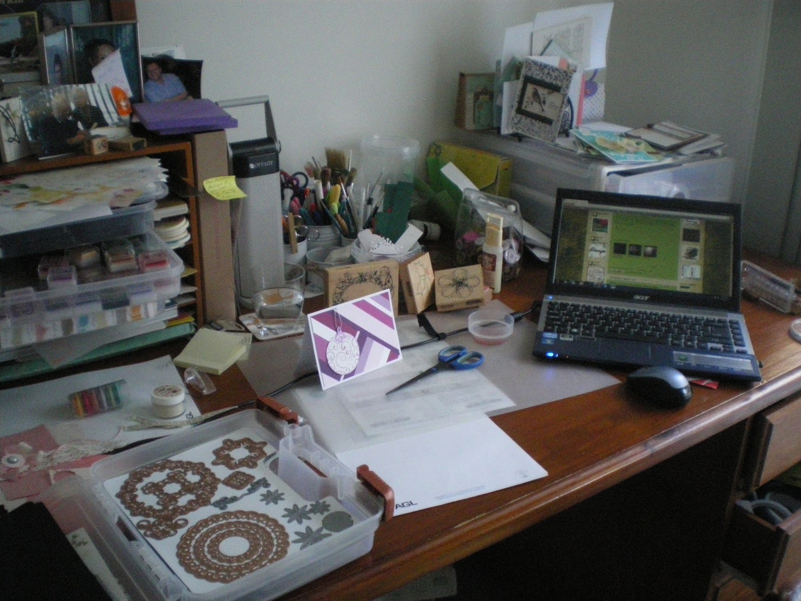 Hi there fellow WOYWW lookers... here's my desk today, not too much going on - I'm making a purple shades Christmas card there in the centre of my desk, with my spellbinder case on the left. I have my embossing folders out too on the other desk.