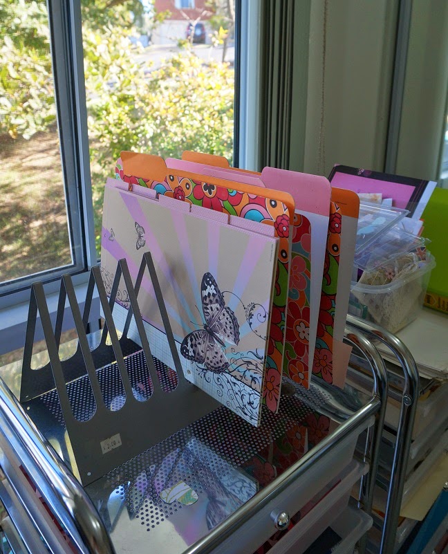 card with hot air balloons I made for a challenge. On the left are the stamps from last session needing to be put away and behind that my sample colours for cards that may or may not happen. Back is a blue card just needing the last details figured before I glue it all together and then send off in a card swap. See also my birdie card holder displaying the latest card arrivals in my mail box.