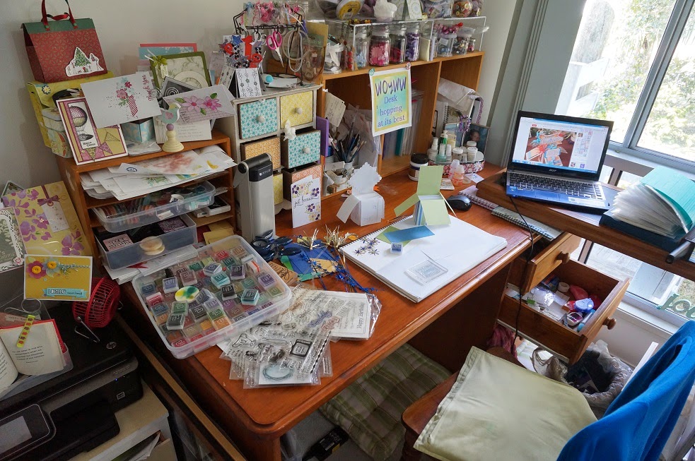 Hi and how is it in your corner of the world today - all good here and I'm a bit later with my post for WOYWW#267 as hubby has just come home and I haven't even thought about dinner...oh well, I've been busy making his father a 90th birthday card, you can see the beginning of it on my desk pad and it's still not finished so I'll have to remember to show you next week. My laptop over there near the window with a folder of stamps. Underneath is my glue and sticky bits drawer open because I've just cleaned it out this minute (when I took the pic this morning) as it had become a dumping spots for allsorts...why do you do that...got an important card to finish and I'm tidying things. Pic below just a close up.