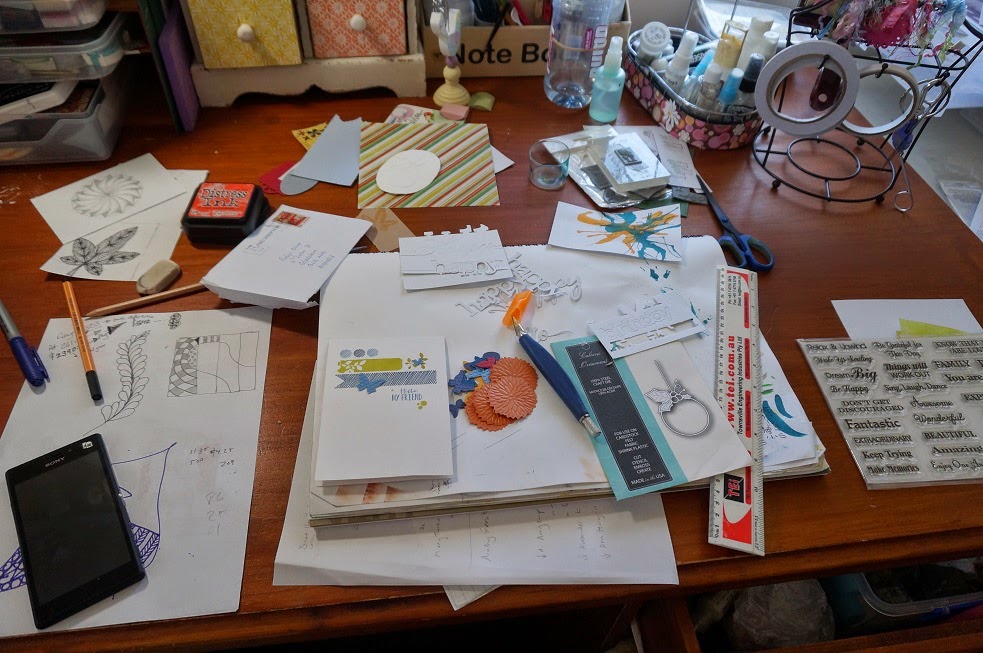 Whooops, I nearly forgot to post my desk today - its week 278 at WOYWW...I took the photos this morning and now it's dinner time. Not a very productive day today, yesterday was a lot better. Just a bit messy with all sorts of stamping bits about. Top pic...on the right is my box of dies neatly contained on magnetic sheets except now I have a few more and now sheets left. Next to that is a folder containing die cuts I've made with friends dies or they have been kindly sent to me or I've cut them and then decide nope that that shape. Main desk pic, you can see I've been doodling some more zentangles on the left, check out my card I made last week (here), friend Vikki's birthday today so I posted it late last night. On my work pad is a card from Janet in Mauritius for the Card Chain Challenge, along with some lovely die cuts. Also my new ornament die is out again and you might see that card base in yellow and blue - using the old blow the paint technique (card here). Well I hear hubby mashing the spuds to have with our corned beef so I'd best post this and will be back later to check out some desks.  If you're wondering what this is all about pop over to our hostess Julia for details - it's fun and addictive. Cheers and enjoy your week Robyn