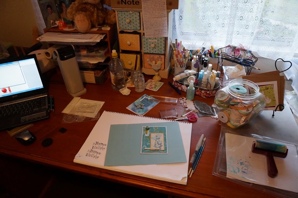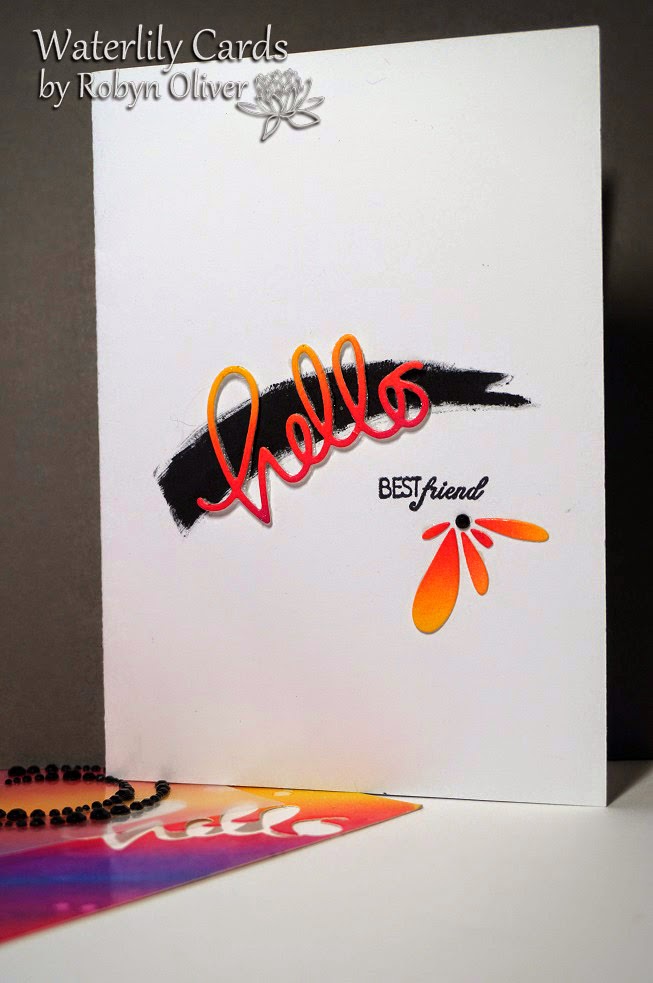 Virginia asked for a 'clean slate' - lots of white and one layer. I'd been rummaging in my drawer of backgrounds I'd made years ago with my brayer and Kaleidacolour multi colour die inkpads and this one (still lovely and bright) caught my eye. I simply die cut 'hello' and raised it over a slash of black ink (through a stencil I hand cut in paper). Then stamped the sentiment and decided to used to leftovers from the die cut and a black gem to finish the card.