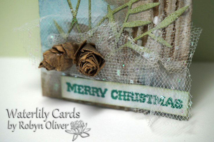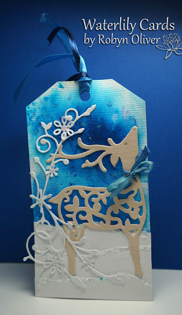 Again I used the girls tags as inspiration - Lolls gorgeous reindeer tag had me using this reindeer die cut and swirly sprig which I mounted on a background made with Brushos dotted with glitter glue. Torn white card layers for the snow and a bow for the deer and ribbon ties.