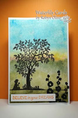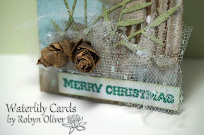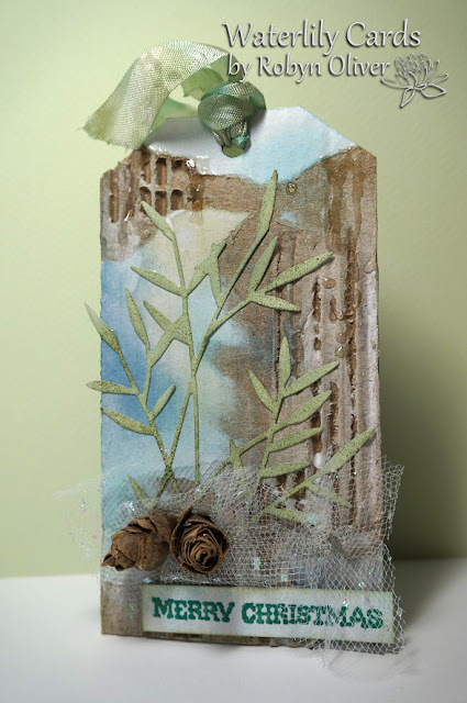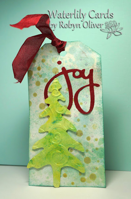 Kathy made a tag using a die cut tree - so here is my version - I mounted the tree over a Brushos coloured background decorated with star stencil and coloured texture paste. I added gold glitter to the large star and to form a base for the tree. Finished off with some white embossed sentiments and a tinsel tie. Thanks for taking a peek