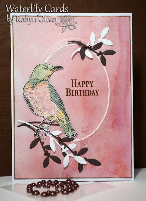 I have used the sketch at Fusion Card Challenge-Season's Greetings. I chose to have a spell from Christmas cards and am adding to my depleted stock of Birthday cards.  I used an oval die to create the frame on this Distress Inked background and the stamped and coloured my bird and added a few die cut branches and gems.  Thanks for taking a peek, and Happy New Year