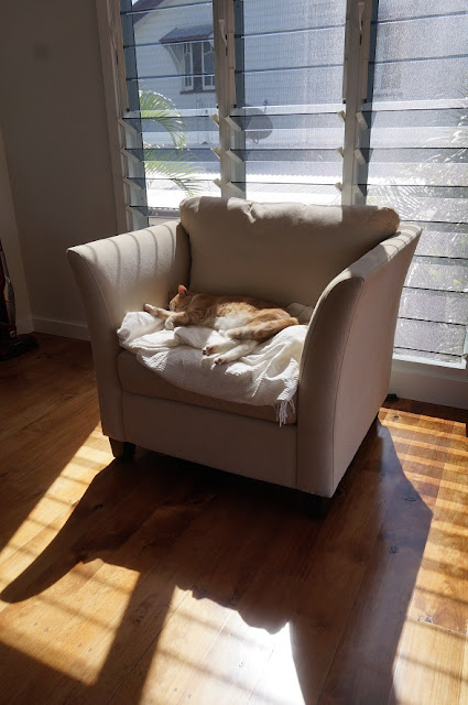 Here I am enjoying breakfast on my favorite front deck - it catches the morning sun and is such a relaxing spot. And Arthur has also found a comfy chair for his snooze.