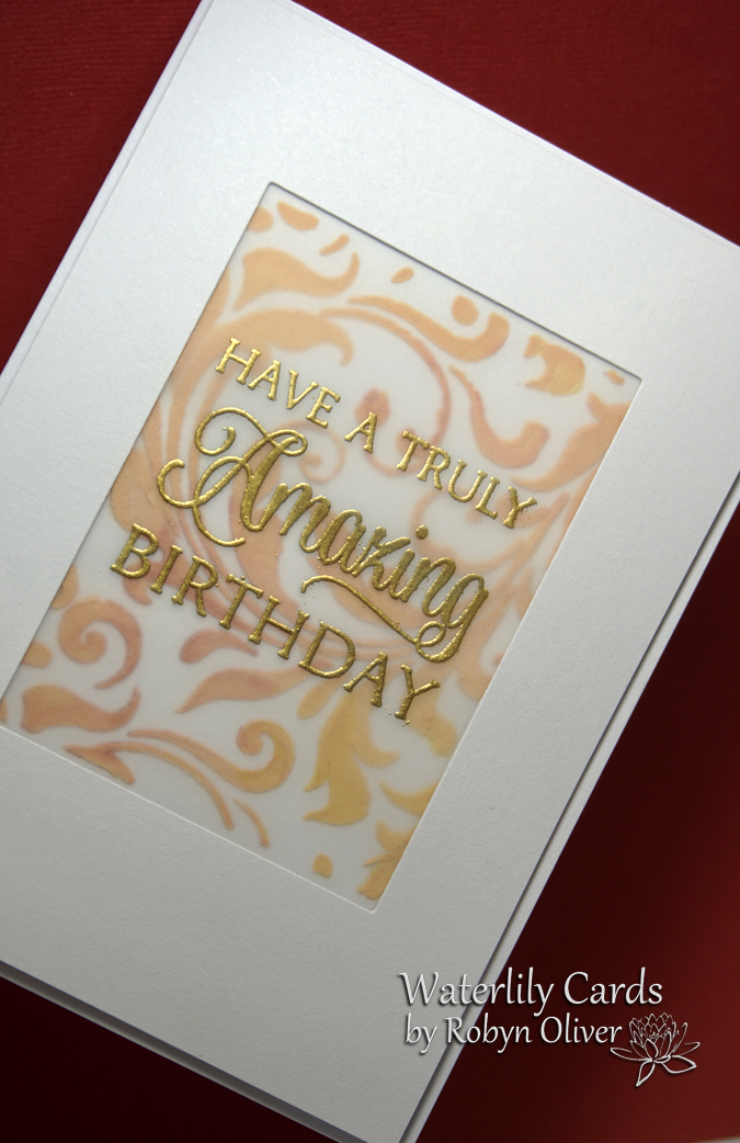 I cut down the panel and cut a frame in white card.   Then gold embossed my sentiment on vellum and attached that the to back of the frame.  I used foam sheet under the frame to give it a lift and raise the vellum off the stenciled panel.