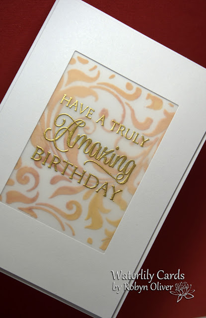 For this card I created a coloured textured stencil background to go under my vellum layer bearing my sentiment.  I mixed textured paste on my plastic sheet with four shades of Distress Oxides - mustard seed, dried marigold, carved pumpkin and ripe persimmon... using a palette knife I scraped the different shades over my flourish stencil onto white cardstock and left it to air dry....